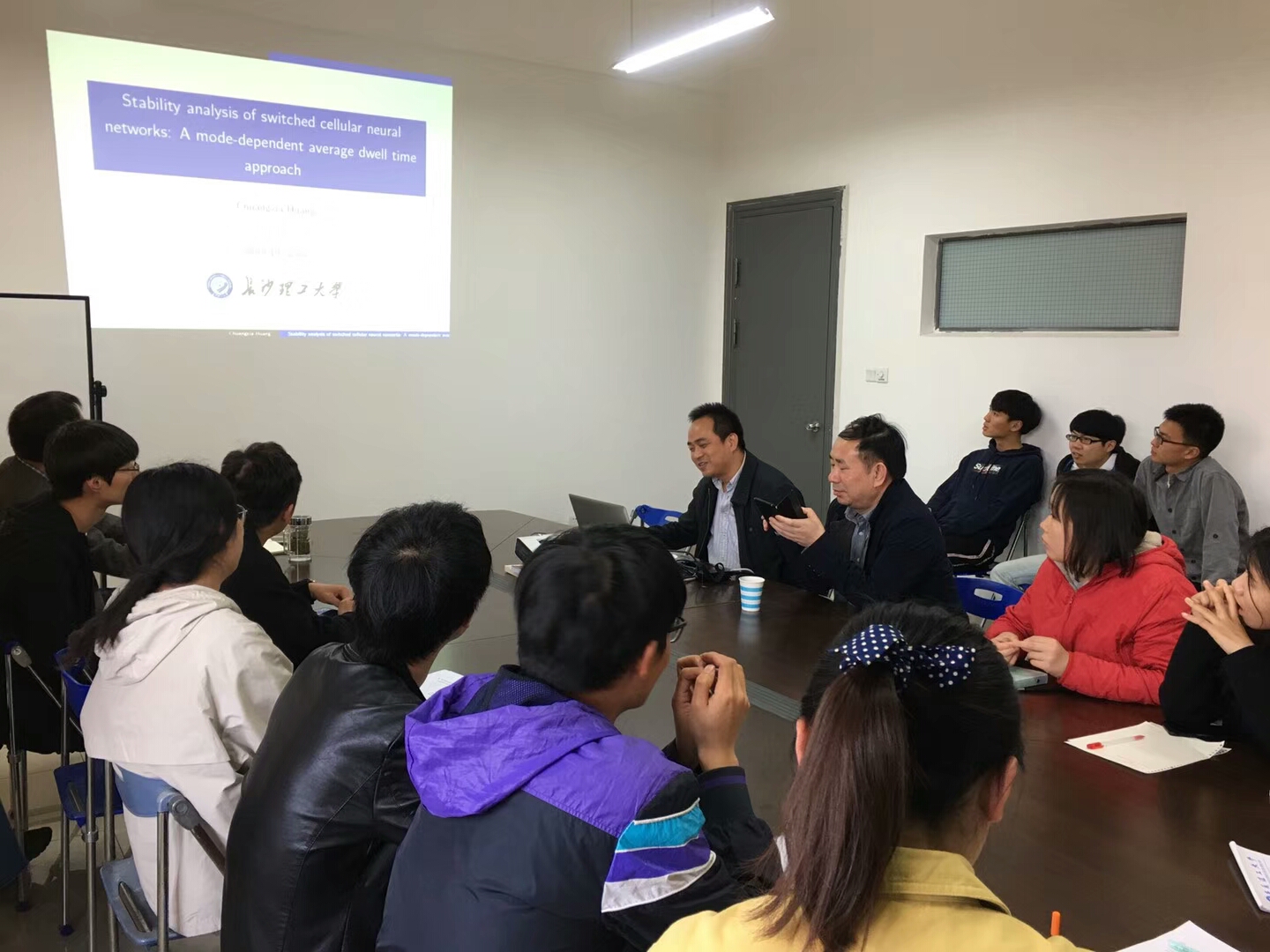 4月15日下午,长沙理工大学数学与统计学院院长黄创霞教授作了题为《切换神经网络系统的稳定性分析》的报告。他分享了其课题组在分布式时延情形下确保一类切换细胞神经网络指数稳定性的最新成果。