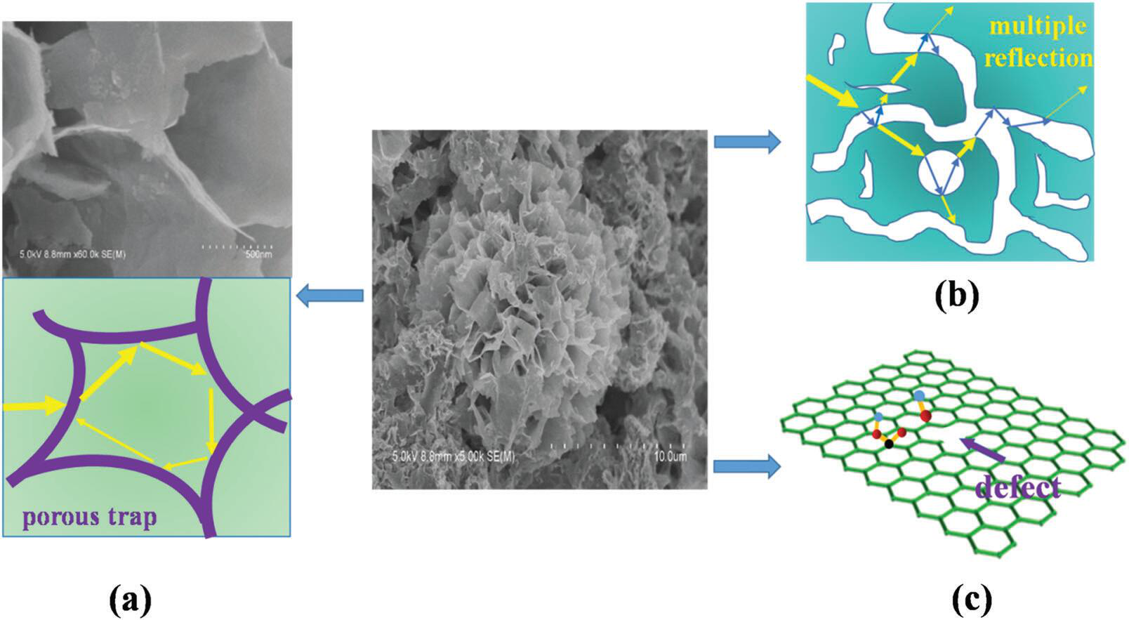 相比于在片层石墨烯上修饰、负载和镶嵌纳米材料,本研究从逆向思维的角度出发,在均匀分散的石墨烯溶液中加入镍盐,利用六次甲基四胺提供的弱碱环境,经过水热和奥斯瓦尔德熟化生成花状多孔微球(5-10 um),从而实现在大尺度微球上部分包裹二维石墨烯片材。研究结果表明:花状石墨烯/氧化镍微球具有大的表面积(107 m2g−1)、三维多孔骨架和空间极化。自组装氧化镍“花瓣”,因缺陷和孔洞的存在,为电磁波的损耗提供了更多的作用和反射位点,有利于电磁波因相位抵消而被损耗。该研究制备的复合材料在厚度为1.7 mm时,最佳损耗值可达到-59.6分贝。此工作为设计新型高质量的电磁波吸收材料提供了设计思路和理论参考。
