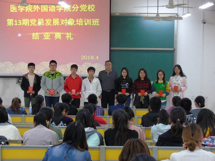 4月24日中午,医学院外国语学院分党校第13期发展对象培训班结业典礼在明理106教室举行。医学院党委副书记(主持工作)刘群红出席典礼,并为学员代表颁发了结业证书。