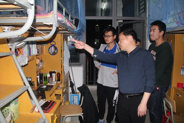 检查学生宿舍过程中,王永祥详细地询问了部分同学的假期去向,他指出,假期安全问题是一个老生常谈的问题,必须高度重视,要严格如实做好请销假工作。检查组对各个宿舍进行隐患排查,检查宿舍卫生,指出室内产生的生活垃圾必须及时处理,特别强调宿舍安全用电和禁烟问题。王永祥要求全体辅导员一定要加强对学生的安全教育管理,确保学生安全无隐患,平稳度过五一假期。