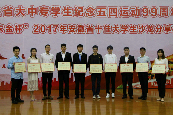 5月5日上午,全省大中专学生纪念五四运动99周年暨“农金杯”2017年省“十佳大学生”沙龙分享活动在合肥学院举办。我校安徽省“十佳大学生”刘崇岩同学参加活动,现场作了分享交流并接受表彰。