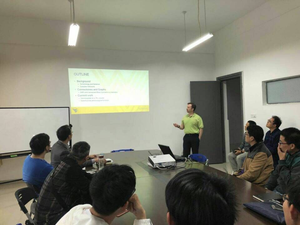 Edgar Fuller教授先简要介绍了相关图论知识及网络分析技术和算法,重点介绍了其团队基于收集到的老鼠眼睛中各种视杆和视锥神经细胞、无长突神经细胞、双极细胞、神经节细胞等感知数据,将数据进行处理并结合相关网络分析技术建模得到老鼠视网膜神经网络,进而研究了老鼠视网膜神经网络的社团结构、模体划分等问题并给出了相应的生物学解释。Edgar Fuller教授的报告内容详实,展示了图论和网络科学在生物信息学中的具体应用,引起了在座师生的广泛兴趣,大家积极与Edgar Fuller教授进行交流。