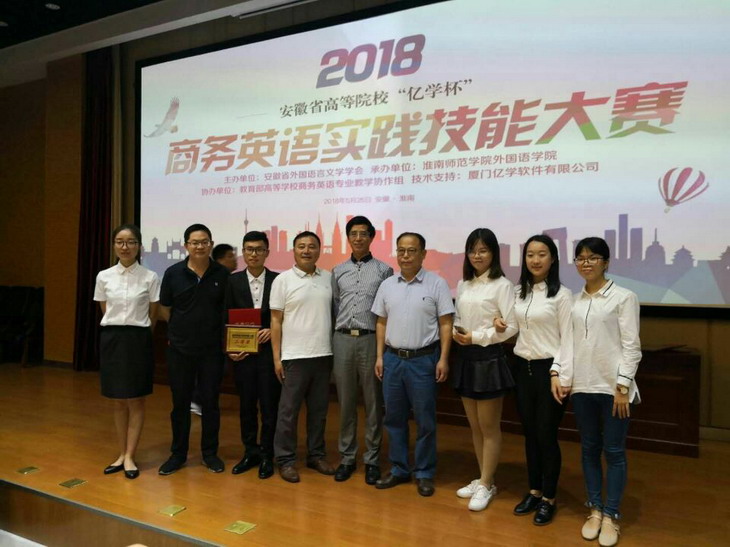 5月25日至26日,安徽省第二届高校“亿学杯”商务英语实践技能大赛在淮南师范学院举行。我校英语专业(商务英语方向)叶体立等6名学生组队参加了比赛并获得了团体二等奖的好成绩。