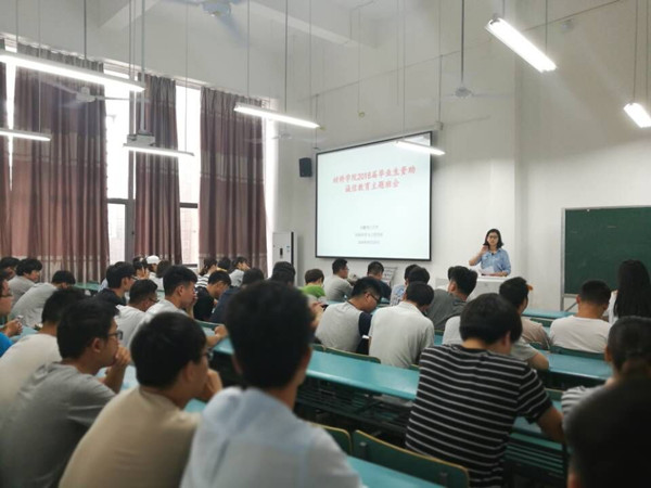 召开主题班会。5月15日上午,材料学院在学院楼B111教室召开2018届生源地助学贷款毕业确认指导暨诚信教育主题班会。毕业班辅导员向学生详细解读了国家开发银行和农村合作金融机构生源地信用助学贷款毕业确认工作的相关细则,要求学生要明确毕业确认工作相关材料的办理流程和填写规范,掌握工作各环节的时间节点,同时要求同学们要以感恩之心、诚信之举有条不紊地完成生源地贷款毕业确认工作。会上,全体同学在《安徽理工大学2018届助学贷款毕业生诚信承诺书》上郑重签名。
