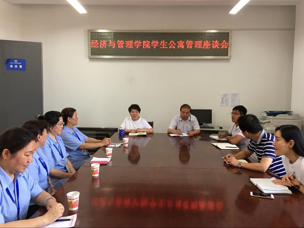 为深入了解学生在宿舍的学习生活情况,加强学院管理与宿舍管理的联动,6月13日下午,经济与管理学院在崇信楼三楼会议室召开学生公寓管理座谈会。经管学院党委书记武有水、党委副书记马蓓蕾、学院全体辅导员和班主任以及相关公寓宿管阿姨参加了座谈。
