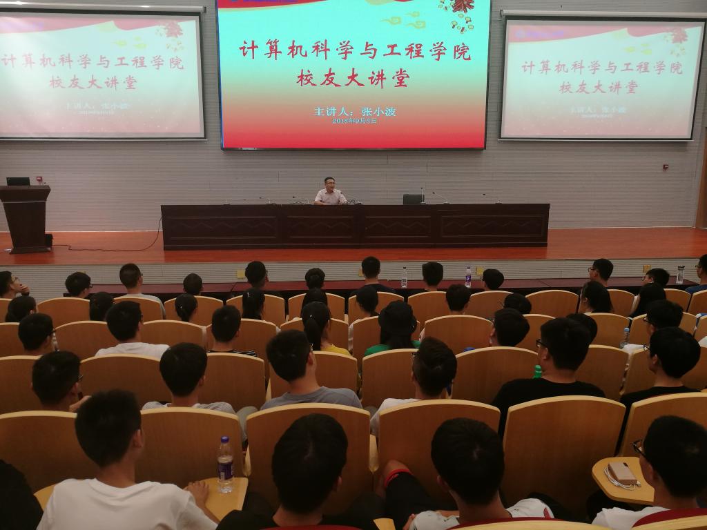 9月8日下午,计算机科学与工程学院首期“校友大讲堂”精彩开讲。学院邀请计算机及应用专业2002届校友,安徽省“特支计划”创新领军人才、淮南江淮云产业联盟主席、安徽科艾网络技术有限公司总经理张小波走进“校友大讲堂”,为近500名学生作了题为《我的大学生活》的专题报告。计算机学院党委副书记兼行政副院长张旸主持报告会。