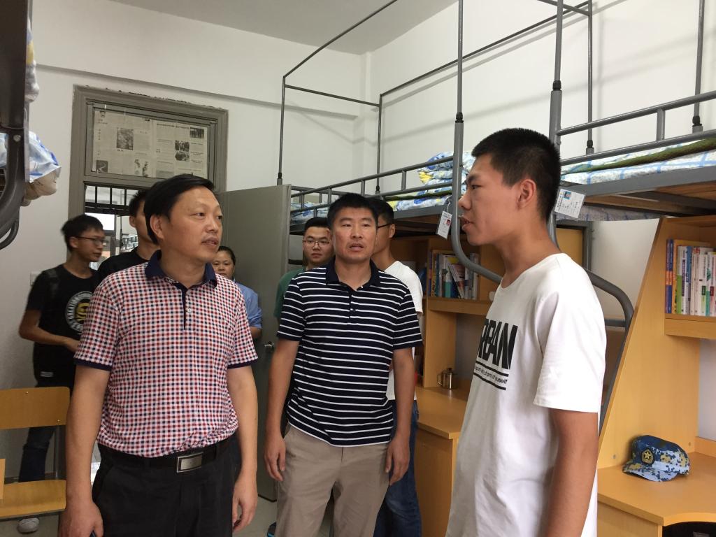 院领导走进各专业的新生宿舍,与新生们亲切交流,细心询问他们到校后的住宿、就餐以及对大学生活的适应等情况,了解新生入学后的需求,查看了新生宿舍的卫生状况,对新生良好的宿舍环境给予了认同和表扬。王永祥对正在进行军训的新生们提出了要求,希望他们发扬吃苦耐劳的精神,出色完成军训任务,并特别叮嘱新生军训期间要合理饮食、注意身体,有困难向辅导员反映。张旸嘱咐同学们要注意人身财产安全,谨防诈骗,要互相关心帮助,共同创建良好的宿舍氛围。