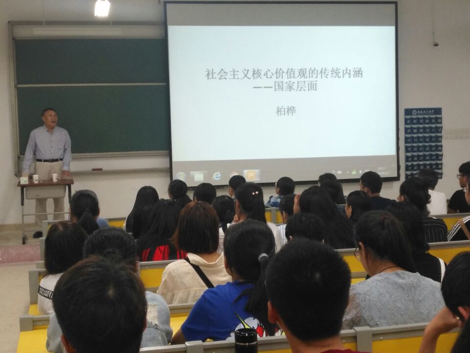 9月17日晚,人文学院著名教授、博士生导师柏桦在学校天工南216教室作了一场《社会主义核心价值观的传统内涵——国家层面》的专题报告。学院2018级全体新生聆听了报告。