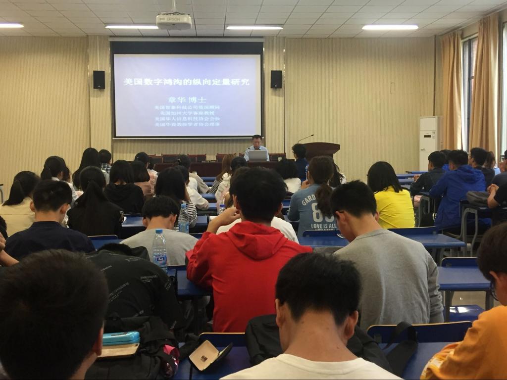 9月17日下午,应国际交流与合作处、自然科学处和数学与大数据学院邀请,教育部“春晖计划专家”、美国加州大学章华教授在数学与大数据学院一楼学术报告厅作了题为《数字鸿沟调查及社会人口统计因素:美国互联网用户的纵向定量研究》的学术报告。数学与大数据学院院长方贤文主持报告会,业务副院长李德权、学院部分青年老师和各专业学生共100余人聆听了报告。