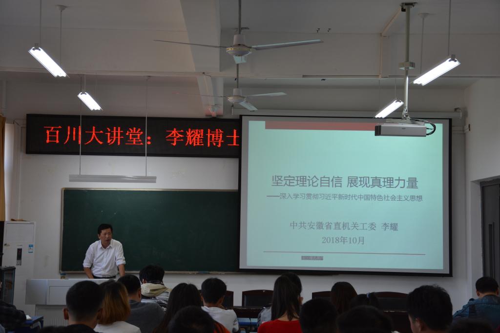 10月12日下午,党委宣传部和计算机科学与工程学院共同举办“百川大讲堂”,邀请中共安徽省直机关讲师团李耀博士在求本楼B401报告厅,围绕习近平新时代中国特色社会主义思想作宣讲报告。报告会由计算机学院党委书记王永祥主持。
