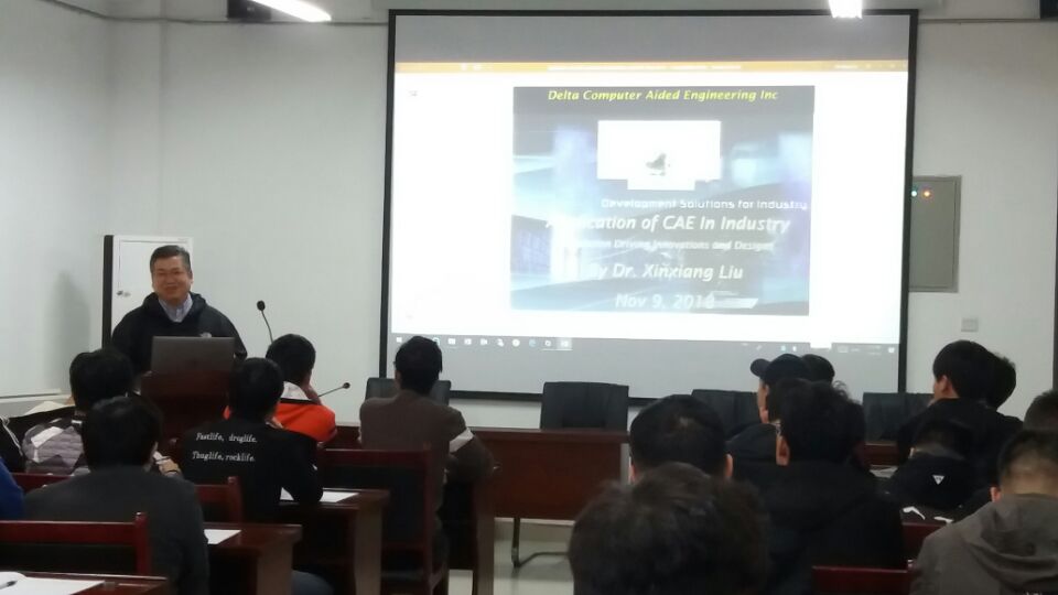 应自然科学处和力物学院邀请,11月9日下午,美国 Delta CAE Inc和中国无锡三角洲计算机辅助工程有限公司总裁兼总工程师刘新祥博士在院报告厅作了题为《CAE仿真在工业设计中的应用》学术报告会。报告会由副院长圣宗强主持。2016级工程力学专业学生和部分教师约80人参加了报告会。