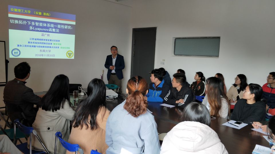 应数学与大数据学院邀请,11月20日上午,国家优秀青年基金获得者、东南大学温广辉教授在数大学院会议室作了题为《切换拓扑下多智能体系统一致性研究:多Lyapunov函数法》的学术报告。学院青年教师和研究生30多人聆听了报告。