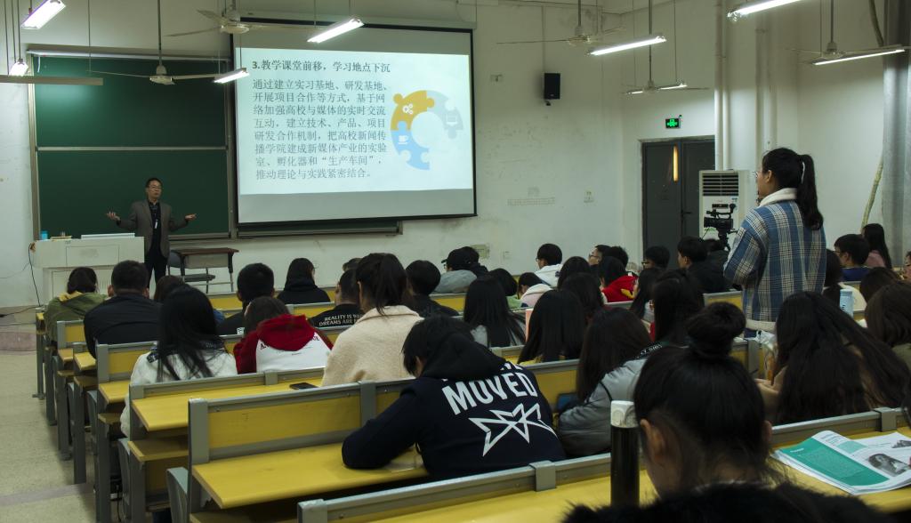 孙玉宝从事新闻工作30余年,发表新闻作品近300万字。报告会上,孙玉宝对“新媒体时代,我们需要怎样的人才”以及如何培养高水平、复合型创新人才作了深入浅出的阐述。他指出,新媒体时代必须拥有一支既有传统新闻素质和底蕴,又具备互联网思维和“互联网基因”的人才队伍,“对学生而言,要围绕多媒体对人才的综合需求,广泛学习和涉猎横跨社会科学、自然科学等多学科交叉的内容”,“多媒体有十八般兵器,我们就要掌握十八般武艺。”针对我校网络与新媒体学科建设,他认为,高校应该需要设置一些前瞻性、融合性和交叉性的专业,建立实习基地加强高校与媒体的实时交流互动,推动理论与实践紧密结合。