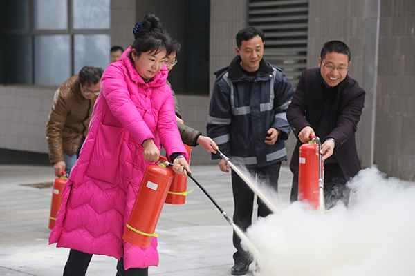 讲解结束后,在崇义楼一楼彭广峰又指导教职工进行灭火演练。面对熊熊燃烧的火堆,教职工们表现沉着,熟练地按照灭火标准,正确迅速地将燃起的大火成功扑灭。