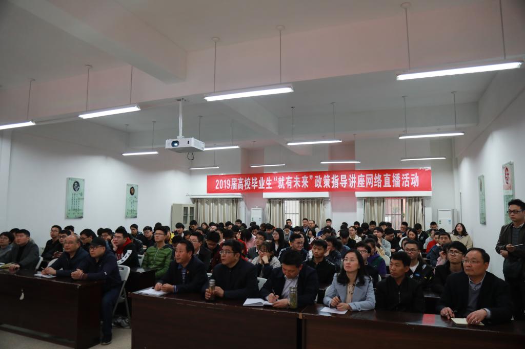 3月27日下午,由安徽省教育厅和安徽省人力资源和社会保障厅联合主办的2019届全省高校毕业生“就有未来”政策指导讲座网络直播活动在合肥举行,学校在厚德馆B207设立分会场,组织广大师生进行收看。校党委常委、副校长董雨参加了此次活动。各学院党委副书记、毕业班辅导员、毕业生代表200多人聆听了讲座。
