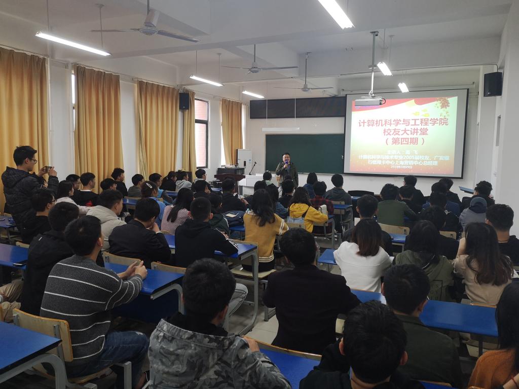 3月18日下午,计算机学院在求本楼B401举办校友大讲堂。计算机科学与技术专业2005届校友、广发银行信用卡中心上海营销中心总经理高飞应邀作报告。院党委副书记兼行政副院长张旸主持报告会。2017级近100名学生听取报告。