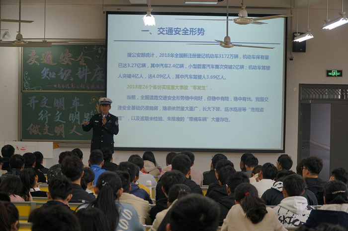 4月8日,学院专门邀请淮南市公安局交警支队朱波警官,在明理202举行交通安全知识讲座。朱波通过典型案例,讲解了超速行驶、超载、疲劳驾驶等交通违法行为,展示了违反交通法律法规的严重后果及危害。他结合淮南本地的交通安全状况,采取问答互动的方式,用通俗易懂的语言讲解了关于人行道、斑马线、红绿灯、十字路口等交通基本安全常识。重点强调,走好人生路,更要走好安全路,呼吁师生们要自觉遵守道路交通法律法规,争做文明交通使者。同学们听后纷纷表示,要当好交通安全知识宣传员,积极向家人、同学宣传交通安全知识,让更多的人了解交通安全知识,做一名文明交通参与者。