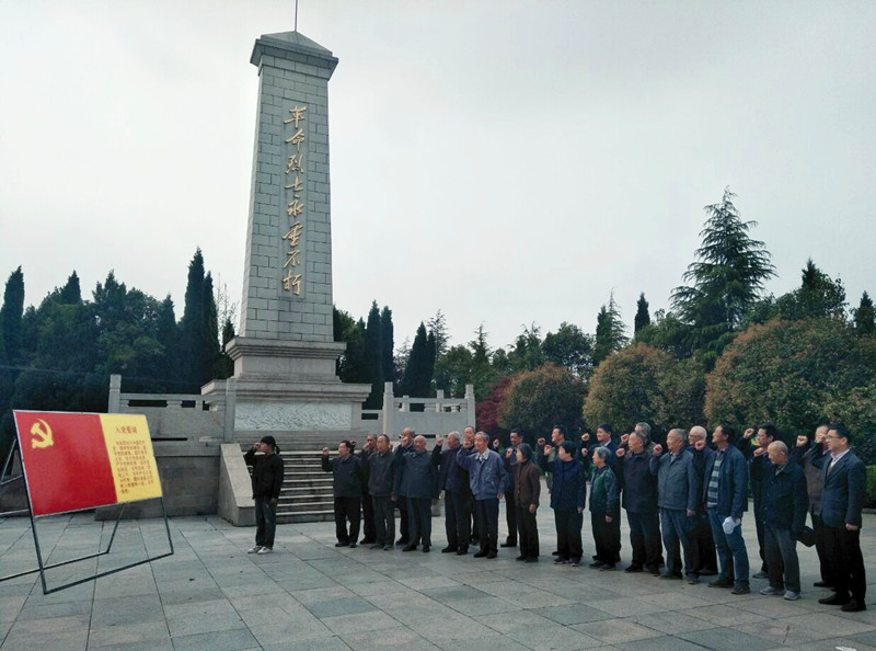 在革命烈士纪念碑前,全体党员肃立,面向烈士纪念碑,怀着十分崇敬的心情向革命烈士鞠躬致意;面向鲜红的党旗,大家高举右手,重温入党誓词;随后,大家观瞻了陵园内碑记、烈士墓碑、碑廊中的碑刻和《凤台县烈士名录碑》;最后,参观了板张集革命历史展览馆,三个展厅展出了凤台地区大革命时期、土地革命战争时期、抗日战争时期、解放战争时期和建国以来凤台巨变五个阶段的300多幅珍贵图片和数据,勾勒出了凤台县百年的历史沧桑。