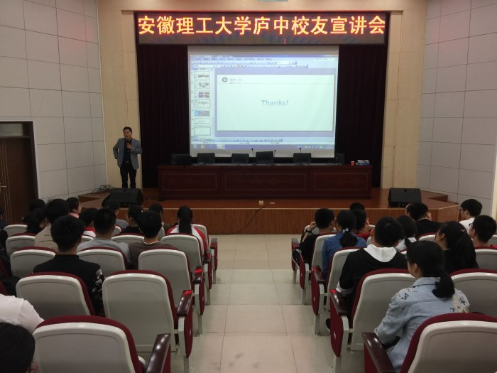 庐江中学1998届毕业生、机械学院机电系主任马天兵教授介绍了学校的办学历史、招生就业、教学科研、学科建设情况以及针对优质生源地招生的相关优惠政策,详细介绍了机械学院建设发展情况、学院的特色专业以及学生所取得的各项成果,并就中外合作办学的机械电子工程新专业作了重点推介。车辆16-2班吴磊、机设15-3班刘星、车辆17-2班李伟作为两所中学的毕业生分享了各自在安徽理工大学的成长与收获,并介绍了学校优秀的办学条件、优美的校园环境以及学校的奖助体系等情况。