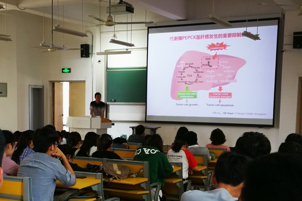 袁海心以“细胞代谢稳态调控与肿瘤发生”为题,主要介绍了细胞的分解代谢和合成代谢的互为调控关系、糖代谢在基础代谢中的中轴作用以及糖代谢关键酶PFKFB3和PCK等在代谢重编程和肿瘤发生中的重要调控作用等内容。袁海心还回答了与会师生提出的有关问题。