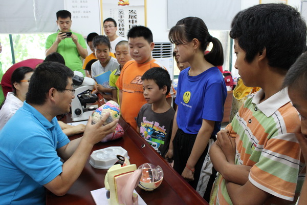 在党员教育功能室,举行了圆梦微心愿仪式。医学院教师党员与孙庙乡二十名贫困学子对接,购买了图书、复读机、书包、文具等学习用品,实现他们在学习方面的微心愿,为他们的学习提供必要的帮助。看到自己的微心愿实现了,学子们都激动不已,现场就打开使用和阅读起来。仪式后,医学院老师和大学生志愿者与对接的学子们进行了互动,向他们介绍人体大脑的系统解剖结构,通过显微镜观看微生物、寄生虫形态,指导小学生们看书、绘画,解答他们学习上的问题,开展了互动小游戏等。