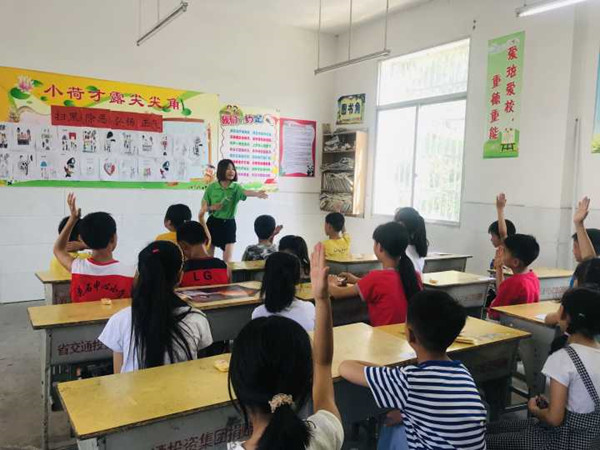 7月6日,实践团来到金寨县花石小学,为当地的留守儿童带去了书包、文具等学习用品,鼓励他们努力学好科学文化知识;播放安全知识动画片,用趣味式教学强化他们的安全意识;游戏互动,消除他们留守的寂寞,与他们度过一个快乐的假期。