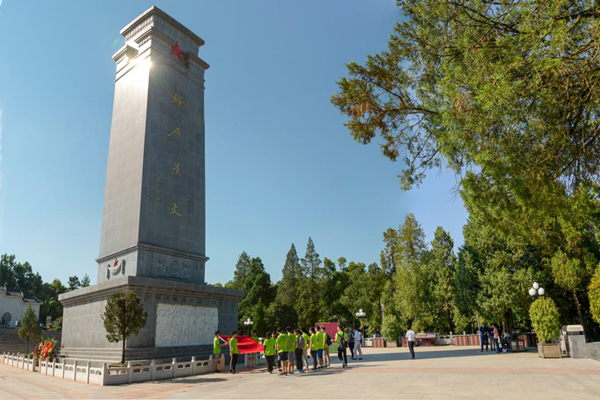 实践团队来到金寨革命烈士陵园。陵园依山而建,拾阶而上,每一阶都寓意着金寨革命先烈作出的不朽贡献。在革命战争年代,金寨县10万青年报名参军,直到1949年全国解放,仅有674人幸存下来。在阶梯的尽头,二十四米高的“金寨县革命烈士纪念塔”映入眼帘,刘伯承元帅亲笔题写的“燎原星火”四个镀金大字刻在塔的正面,诉说着大别山革命老区为中国革命事业作出的不可磨灭的贡献。全体团队成员在塔前三鞠躬,表达对革命先烈最深切的缅怀。队员们在队长的带领下,面向团旗郑重宣誓,立志听党话,跟党走,肩负起民族复兴的时代重任。