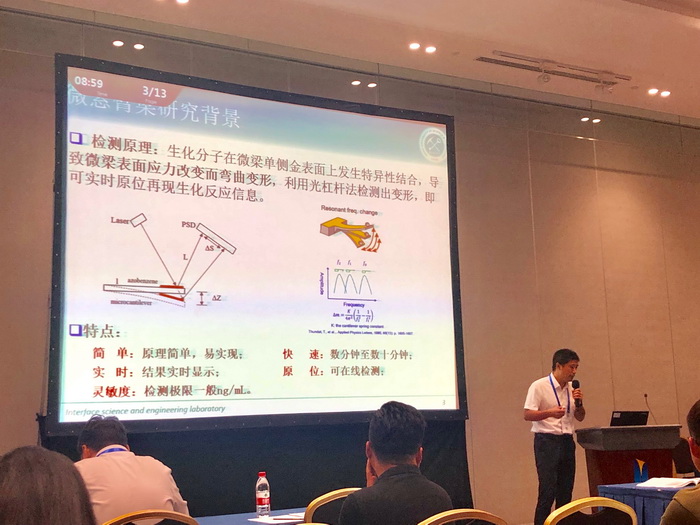 薛长国在MS59实验力学先进测量方法、技术与应用分会场作了题为《基于玻璃透射扫描的新型微梁阵列系统设计》的学术报告。薛长国博士首次提出了基于激光在空中自动定向设计微梁阵列的设想,实现了对微悬臂梁阵列上每根微悬臂梁自由端的精准扫描。基于此设想先后申请了基于平面镜反射、基于玻璃透射和基于平面镜循环扫描微梁阵列等专利。截止2019年8月28日,以安徽理工大学申请人的微悬臂梁相关专利共22项,专利数量居全国第一,其中发明专利12项。以薛长国为发明人的微悬臂梁相关专利共计20项,居全国第二。