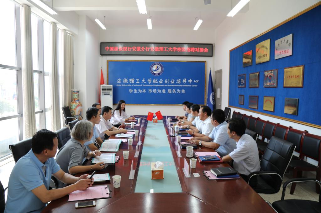9月6日下午,建行安徽省分行人力资源部副总经理马庆,建行淮南市分行党委书记、行长计金保等一行6人来校对接2020届毕业生招聘工作。就业创业指导中心相关工作人员,经管学院、计算机学院、土木学院等学院分管学生工作的领导等参加了对接会。