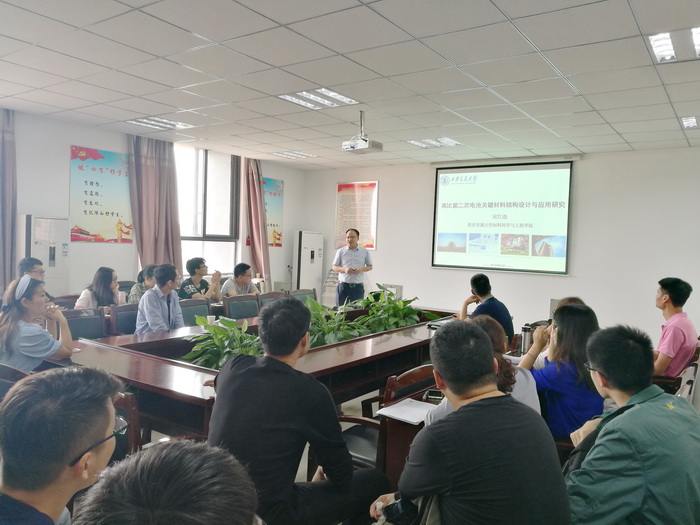 报告会上,宋江选教授以《高比能二次电池关键材料结构设计与应用研究》为题目从传统的锂硫电池的瓶颈到化学吸附的设想和实施、过渡到硅/锂负极电池关键材料方面的最新研究进展,并进一步探讨与高分子材料、有机化学、力学和计算机模拟等领域的交叉研究。叶长辉教授以《柔性材料与器件研究》为题目主要从单晶硅微纳阵列、银纳米线和石墨烯三类重要材料的柔性化技术及取得的原创性多种成果进行了介绍。会后,宋江选和叶长辉到学院材料类相关实验室与部分教师和研究生进行了深入的交流和探讨。