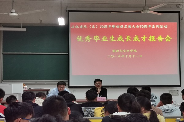 为庆祝建院(系)70周年,10月11日下午,能源学院在天工104教室举行优秀毕业生成长成才报告会。2017届安全科学与工程专业校友、江苏中企科技服务有限公司总经理高盼军,2017届采矿工程专业校友、中国科学院武汉岩土力学研究所博士研究生丁长栋担任主讲。学院200余名同学聆听报告。