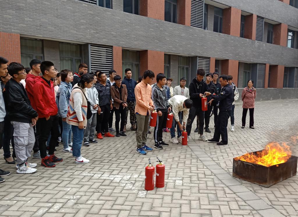 校保卫处消防科彭广峰老师和卢万宝老师为大家演示灭火器的正确使用方法。演练过程中师生们在消防科两位老师的指导下对灭火器进行了操作。