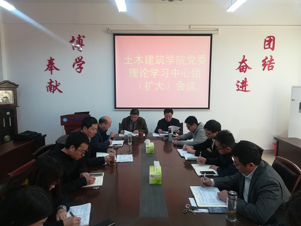 11月13日上午,土木建筑学院党委在求是楼南225会议室召开理论学习中心组(扩大)会议,学习《中国共产党第十九届中央委员会第四次全体会议公报》《中共中央关于坚持和完善中国特色社会主义制度推进国家治理体系和治理能力现代化若干重大问题的决定》《习近平关于< 中共中央关于坚持和完善中国特色社会主义制度推进国家治理体系和治理能力现代化若干重大问题的决定>的说明》。学院党委书记徐冬生主持会议,院党委中心组成员、教师党支部书记“双带头人”、学生党支部书记、学生思想政治辅导员参加会议。