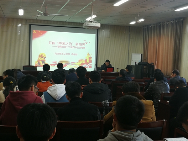 11月22日下午,能源与安全学院邀请校“不忘初心、牢记使命”主题教育讲师团成员、马克思主义学院副教授岳柏冰老师做客“百川大讲堂”,在宁远楼A410会议室作了题为《开辟“中国之治”新境界——准确把握十九届四中全会精神》主题教育形势政策报告。报告会由院党委书记华心祝主持,学院80余名师生党员聆听了报告。