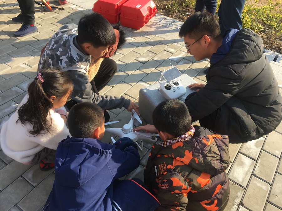 党员们结合学院专业特色,给孩子们带来了全站仪和无人机的演示。遥感科学与技术系支部书记刘超带领自己的研究生团队向小学生们展示了全站仪的使用方法,孩子们分组排好队用全站仪观测信号塔。孩子们对仪器充满了好奇,对神奇的现象感到惊叹,提出了很多问题,学院的老师们非常耐心细致地一一解答。嗡嗡嗡……随着无人机的升空,现场的气氛被推向了高潮,现场欢呼声此起彼伏,孩子们惊呼“太神奇了”。