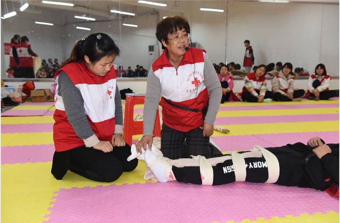 淮南市红十字会相关工作人员围绕救护新概念、心肺复苏术(CPR)、创伤救护(止血、包扎、骨折固定、搬运)、意外伤害的相关救护(气道梗塞急救)等知识展开讲解。整个培训过程注重将救护知识、救护技能与日常生活实例相结合,以实际操作为主,让广大师生进一步了解应急救护基本知识,掌握心肺复苏急救和创伤包扎等急救技能。