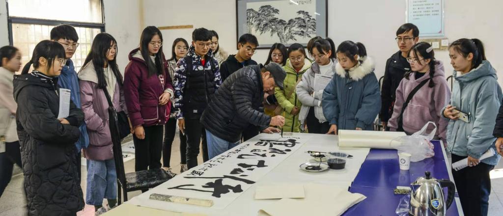 活动现场,老师们在画案前挥毫泼墨,舞动丹青,进行现场书画展示。同学们兴致勃勃地围拢在画案前,一边欣赏,一边不时地向老师提问,老师们给予了详尽的解释和演示。一幅幅字画或遒劲有力、或飘逸灵动、或形神兼备、或气韵生动……精妙的笔墨,散发着艺术的芳香,浸润着师生的心田。同学们还围在梁启忠老师画案前就大家关心的传统文化和书画艺术进行了亲切交流。同学们纷纷表示,此次现场观摩教学活动让自己“零距离”地感受了传统文化的魅力,收获很大。