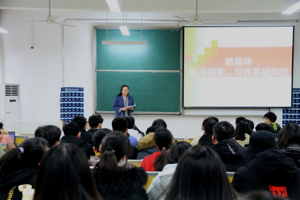 学校新媒体中心、广播站和校报记者团的100余名学生聆听了讲座。