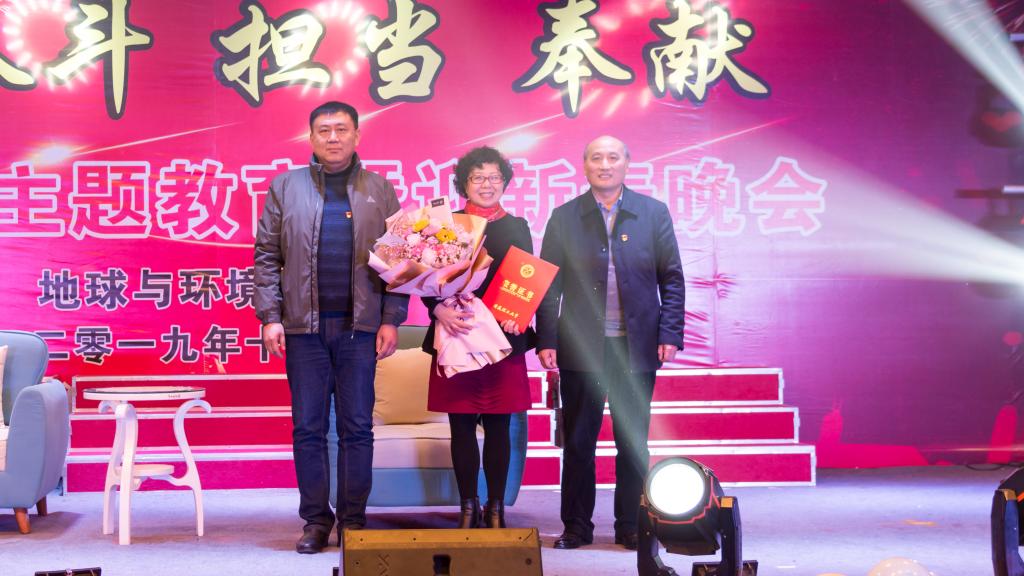 晚会现场,盛鹏飞带领教师们,面对国旗,为争做“四有”好老师进行庄严宣誓,表达了作为一名人民教师的自豪感,抒发了学院教师不忘初心、砥砺奋进的决心和信心。中场师生互动环节,访谈了学院刚退休的陈萍教授。她分享了自己作为恢复高考后的第一届大学生,响应国家号召选择艰苦行业默默耕耘四十载的感人事迹。盛鹏飞、副院长(主持工作)刘启蒙为陈萍教授发了纪念证书,献上了鲜花。