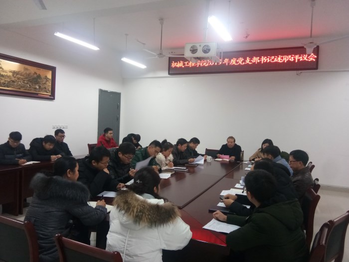 1月10日下午,机械工程学院党委在励学楼A402会议室召开2019年度基层党支部书记述职评议会。学院党政领导班子成员、师生和群众代表30余人参加了会议。会议由学院党委书记武有水主持。