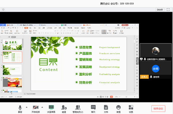 通过腾讯会议平台,各项目团队负责人共享屏幕,依次对项目行业背景、产品服务、盈利模式、发展规划、优势前景等进行了展示汇报。在线评委则围绕项目的先进性、创新性、实践性,从产品核心竞争力、市场定位、财务状况、资源优势等方面进行了询问,并对每个作品存在的具体问题和下一步改进意见给予了指导。