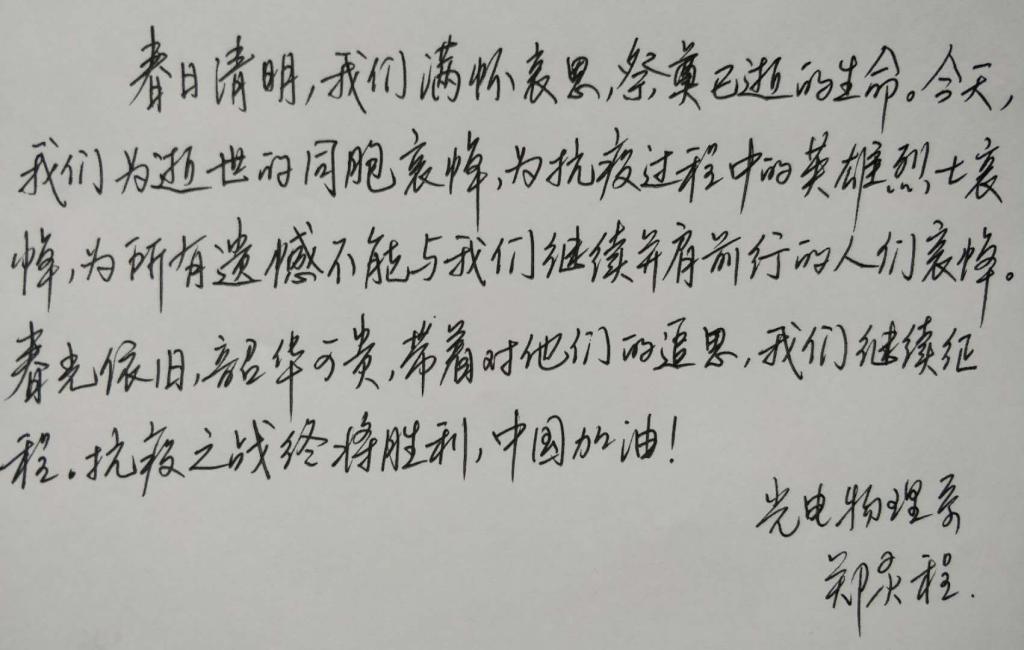 上午10时,随着警报拉响的那一刻,身处不同地方的学院师生纷纷起立低头默哀,哀悼疫情中因抗疫牺牲的烈士们,哀悼因疫情而生命定格在冬季的所有同胞。哀悼结束后,学院组织师生将追思之情诉诸笔端,用手写寄语的方式来表达对烈士的哀悼,对抗疫烈士献身精神的感恩和追思。各班级、团支部还通过主题班会、朋友圈、微博、QQ空间等方式,深切悼念逝者。