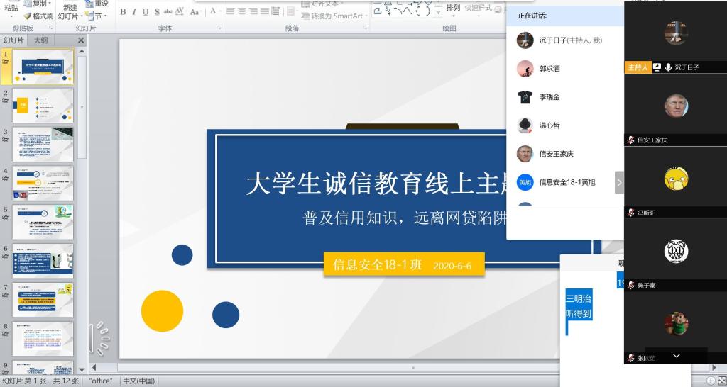 召开诚信主题班会。6月8日至12日,学院辅导员组织非毕业班学生开展了线上诚信教育主题团日活动。通过线上金融知识宣讲活动,观看有关“校园贷”、“套路贷”警示片等形式拓展学生的金融知识面,提醒学生警惕校园贷,避免上当受骗。同时还开展了诚信考试教育、学术诚信教育、生活诚信教育等,引导学生诚实做事、诚信做人。
