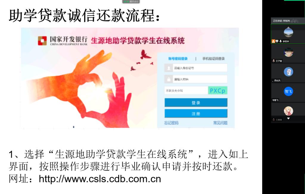 宣读并签订诚信还款承诺书。针对毕业班助学贷款的学生,6月14日下午,学院负责资助工作的老师,通过开展线上诚信还款主题教育活动,详细讲解助学贷款的还款流程、注意事项以及违约还款对个人征信产生的不良后果等。活动中,资助老师还组织毕业班贷款学生在线宣读并签订诚信还款承诺书,提醒毕业班贷款学生严格履行承诺,如期诚信还款。