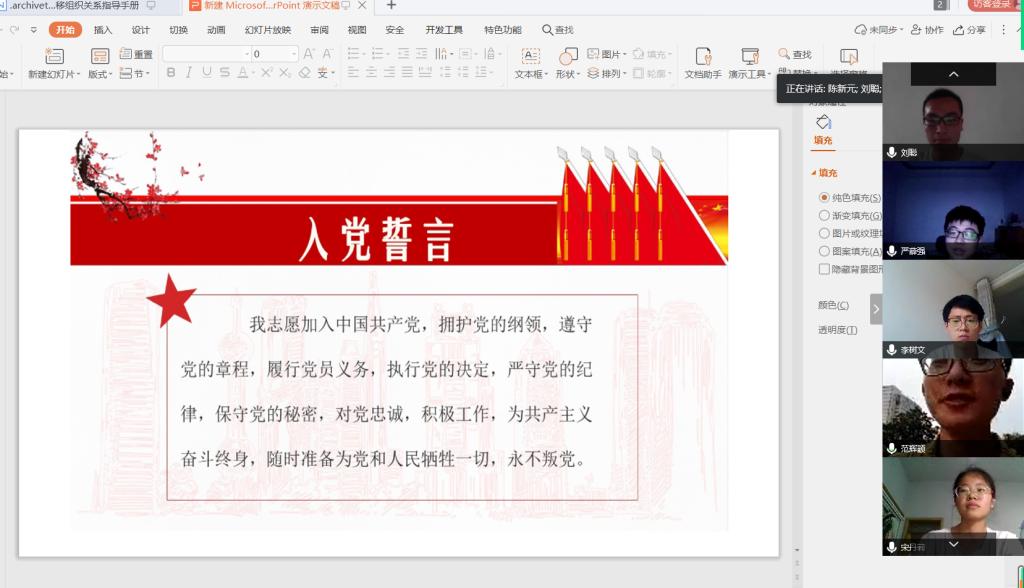 重温入党誓词,牢记党员身份。6月10日下午,毕业班党员举办线上主题党日活动,通过观看电影《建党伟业》,重温了党的建立与奋斗的历程,进一步明确了党的初心和使命。观影结束后,毕业班辅导员带领全体毕业班党员重温了入党誓词,进行了一场心灵的洗礼。院党委副书记张可佳对毕业生党员四年的学习和工作表现给予了充分肯定,希望他们在今后的人生征程中,时刻牢记党员身份,坚持政治理论学习,弘扬青春正能量。