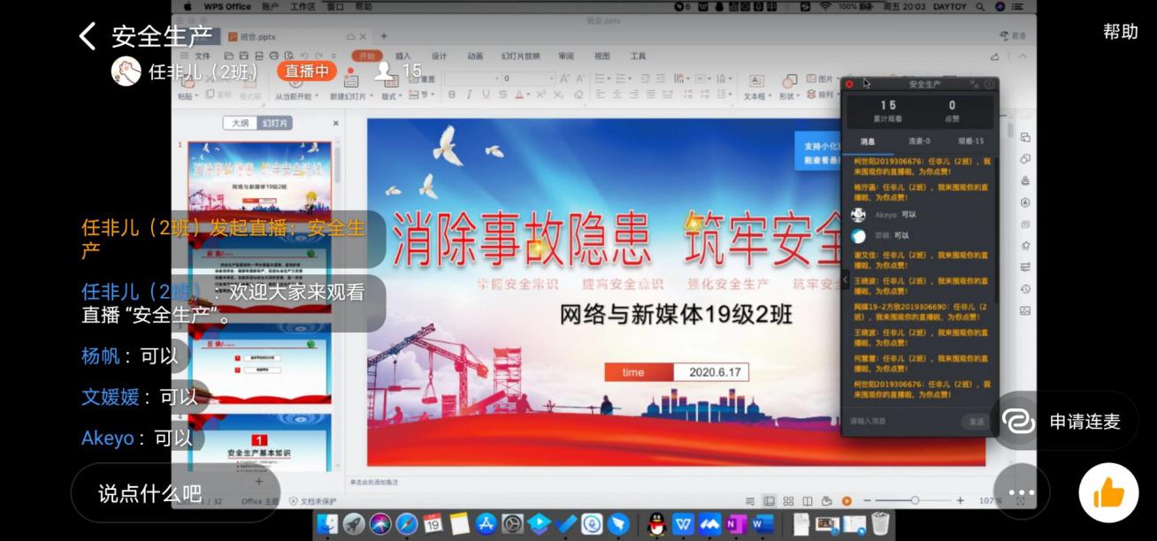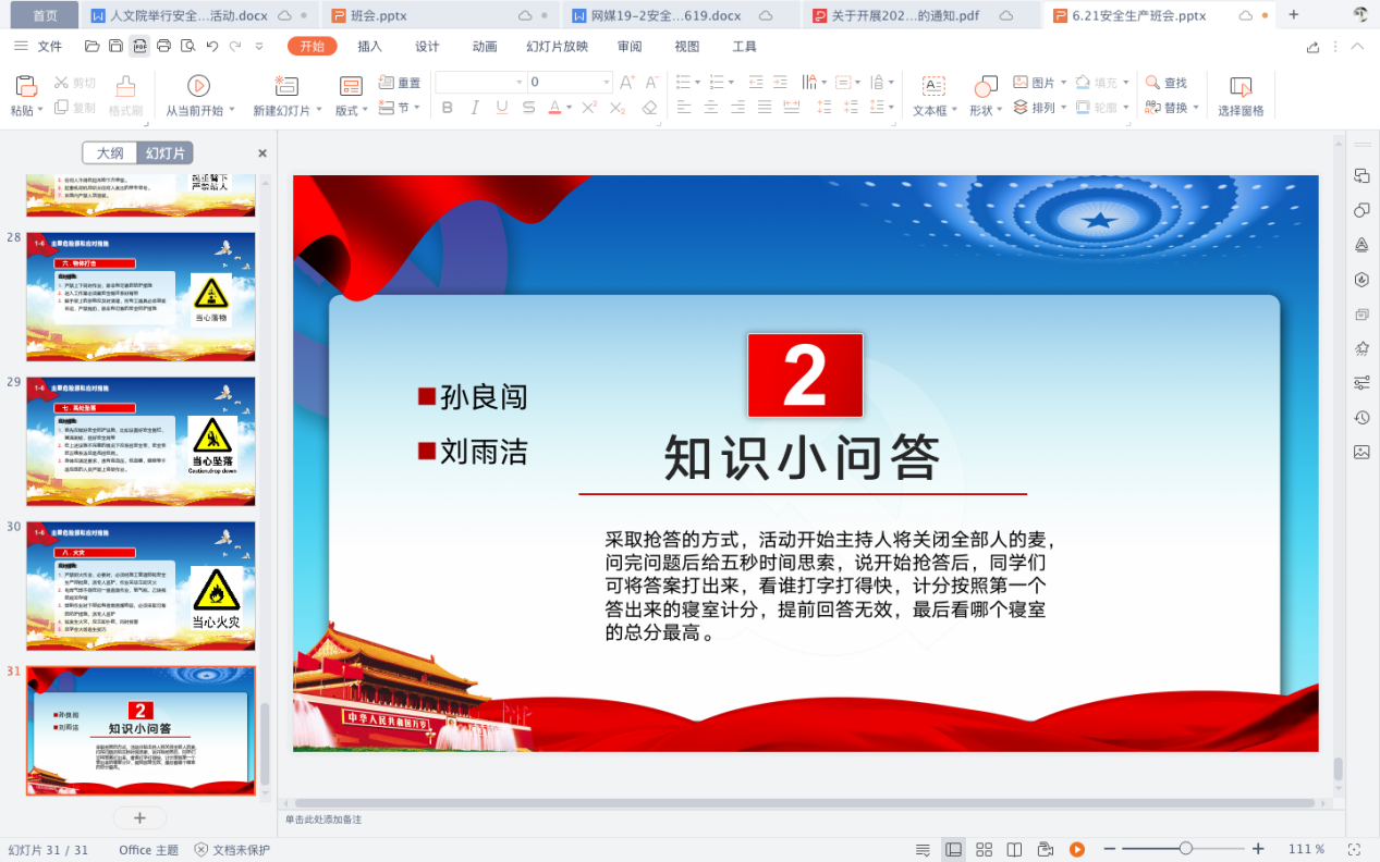 召开线上主题班会。6月17日至21日,学院各班级召开“安全生产月”线上主题班会活动,介绍安全生产月的意义及基本安全知识。其中网媒19-2班通过班委演讲的方式,对日常生活中常出现的安全隐患以及安全隐患常发生的地点和方式进行了介绍,并提醒班级同学采取相关防范措施;政行19-2班则以“知识小问答”的方式帮助同学们更好地记忆和理解与安全生产相关的知识。