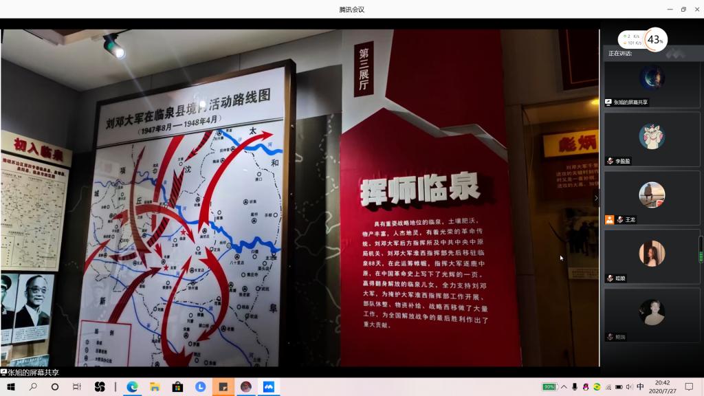 7月27日上午,借助腾讯会议“云端直播”形式,志愿者在临泉县“千里跃进大别山”纪念馆为学院学子开展了一堂线上红色主题教育直播活动。志愿者们通过线上腾讯直播带领全院学子线上参观了“转折前夜”、“千里跃进”、“挥师临泉”、“精神永驻”等四个展厅,一幅幅图文并茂的宣传海报、一件件弥足珍贵的历史实物,逼真地再现了解放战争时期刘邓大军在临泉激战88天的战斗场景,让所有参与线上教育的学生们真切地感受到了革命先辈们“信仰坚定、不怕牺牲”的大无畏革命精神。参观结束后,志愿者们通过组织线上集体默哀的形式向革命先辈表达哀思。