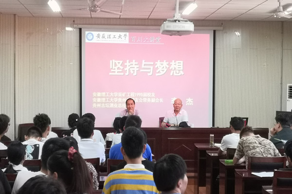 9月5日上午,我校95届采矿工程专业优秀校友、安徽理工大学贵州校友会常务副会长、贵州古坛酒业有限公司总经理李杰应邀回校,在宁远楼A410报告厅为能源学院广大学子作《坚持与梦想》求学创业报告。能源学院80余名学生骨干代表聆听了报告。报告会由能源学院党委书记华心祝主持。
