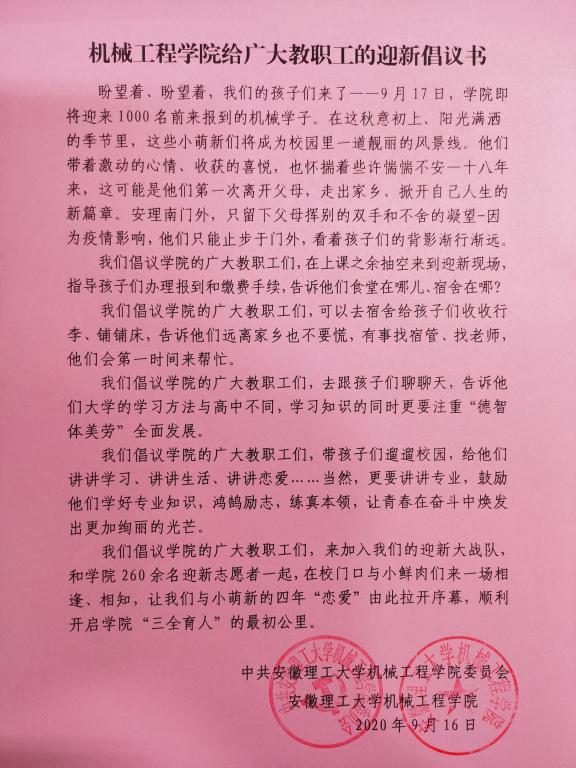 为积极做好疫情防控常态下的迎新工作,顺利开启学院“三全育人”的最初一公里,机械工程学院党委、行政向广大教职工发出迎新倡议。
