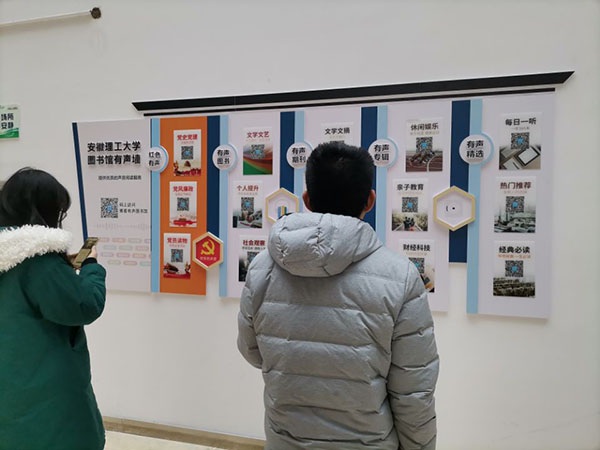 “博看有声墙”设置于馆内四楼东西墙面,分为思想理论、国学经典、成长励志、财经科技等20多个模块,读者只需用手机扫一扫各模块中的二维码,不用下载安装,即可收听由知名主播演绎的“茅盾文学奖”作品等高质量精选有声读物。
